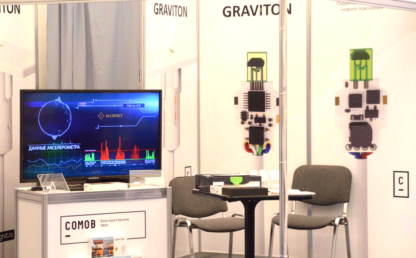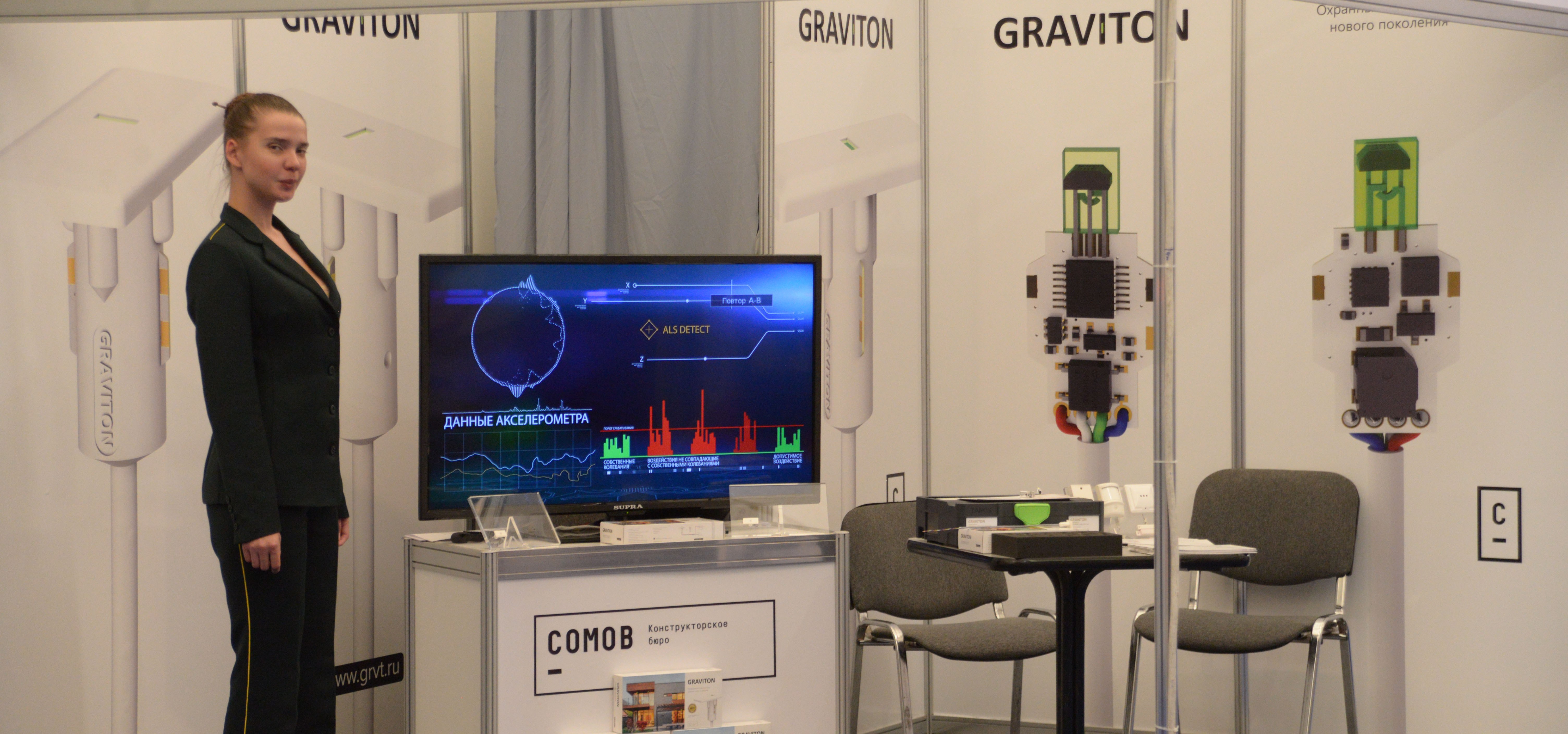 В рамках проведения 20 международной специализированной выставки охрана безопасность и противопожарная защита MIPS 2014, экспертной комиссией конкурса лучший инновационный продукт на первое место номинирован извещатель взлома оконных конструкций GRAVITON, разработанный в конструкторском бюро СОМОВ